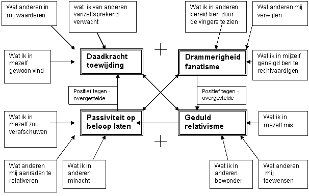 Wat anderen in mij waarderen Wat ik bij anderen vanzelfsprekend verwacht Wat ik in anderen bereid ben door de vingers te zien Wat anderen mij verwijten